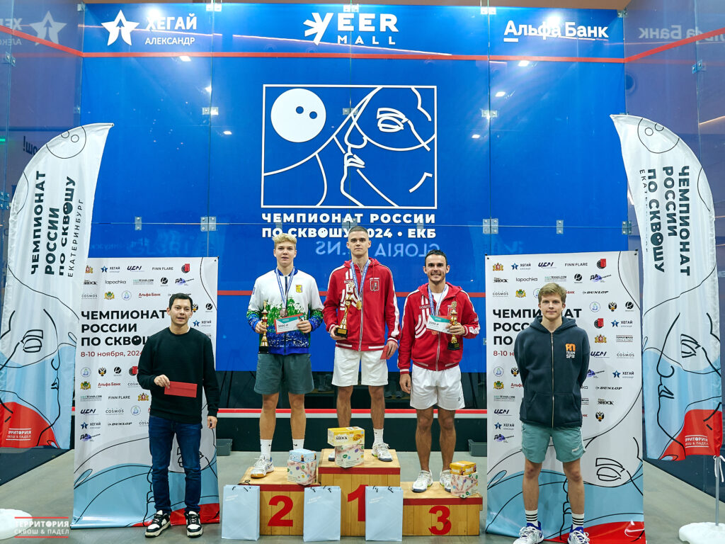 В мужском финале встретились талантливые спортсмены Макар Есин и Алексей Маслов, которые совсем недавно боролись за золото Moscow Squash Open. Тогда, в сложнейшем пятигеймовом матче, одержал победу Алексей. А на Чемпионате России Макар уверенно взял лидерство в финале и стал двукратным чемпионом страны, закончив матч со счетом 3-1: 9-11, 11-5, 11-3, 11-6. Бронзовую медаль забрал Владислав Титов в матче с Матвеем Ячменьковым. Матвей стремительно проходил одного соперника за другим и, несмотря на свой юный возраст, достиг 4-го места.